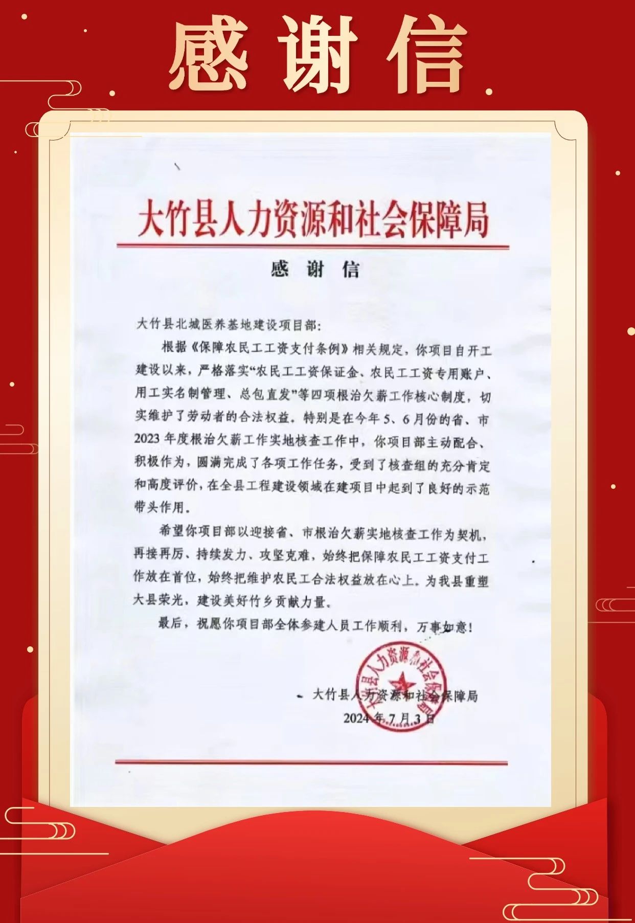 近日,中诚投建工集团大竹县北城医养基地建设项目部收到大竹县人力资源和社会保障局发来的感谢信,信中对项目部落实农民工工资保证金、