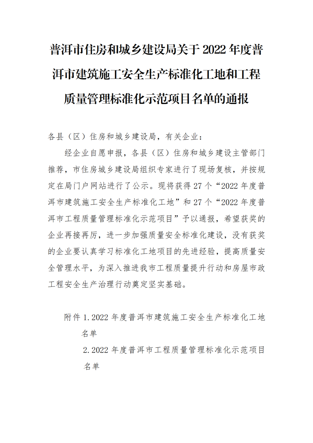 近期,云南省普洱市住房和城乡建设局发布了《关于2022年度普洱市建筑施工安全生产标准化工地和工程质量管理标准化示范项目名单的通