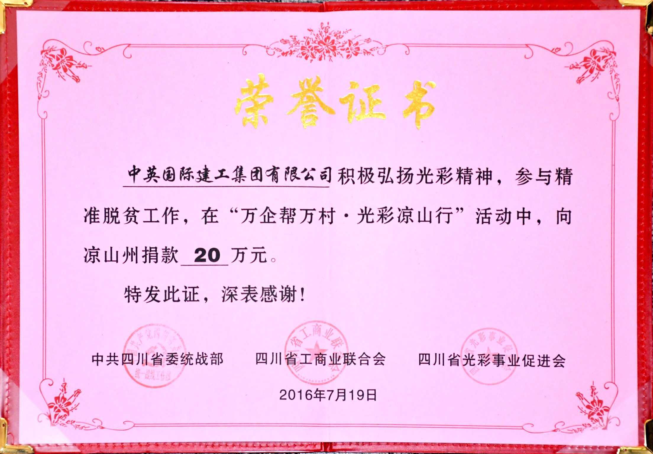 2016年“万企帮万村·光彩凉山行”捐赠证书