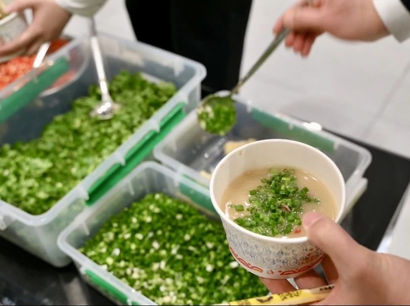 员工食堂里大家有序排队,食堂师傅忙碌地为大家盛羊肉、打汤。鲜亮的汤色让人垂涎欲滴,撒上葱花、香菜,趁热喝上一口,唇齿留香