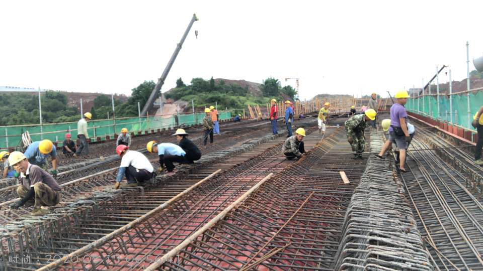 虽已入秋,但内江地区的炎热仍未退去。施工现场,切割声、锤打声、机器的轰鸣声此起彼伏,工人们在10多米高的桥面上紧张地忙碌着。钢筋绑扎、浇筑混凝土,架梁施工……每一道工序的工人们都在挥汗奋战。现场施工正在如火如荼地进行着,繁忙而有序,即使是烈日当头,也挡不住工友们的工作热情。为加快箱梁制作,确保在9月12日必须完成150片箱梁的预制工作,梁场24小时轮班作业。同时,各劳务班组按照倒排工期和施工节点任务,及时增加工人投入到激烈的战斗当中。