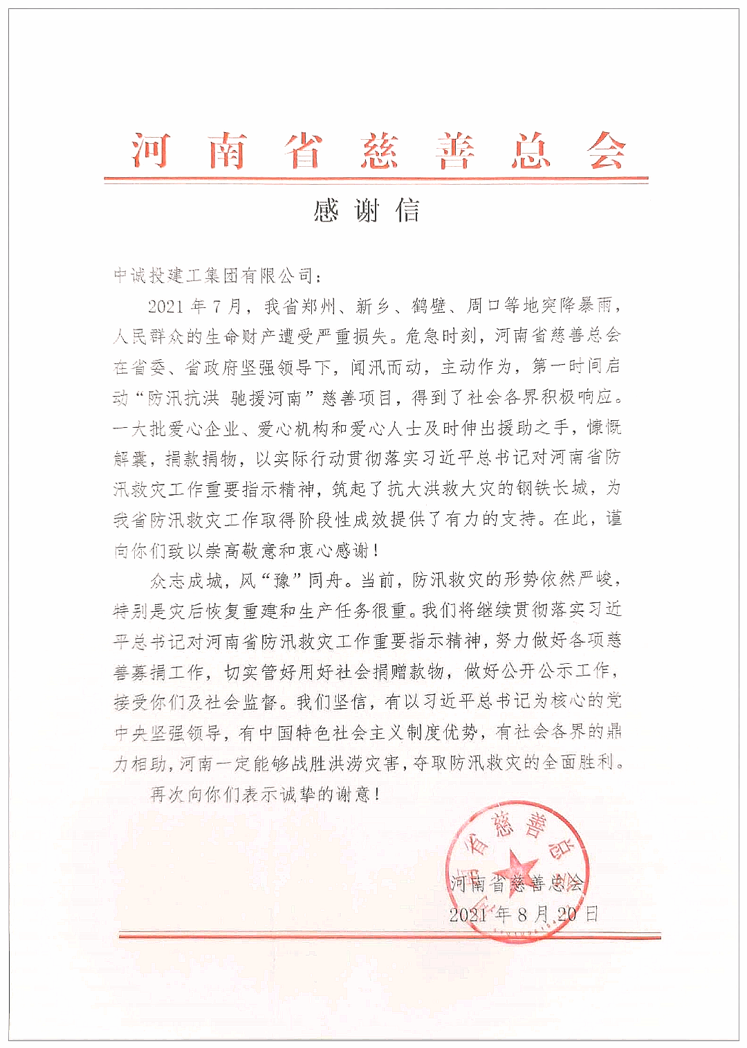 近日,河南慈善总会给中诚投建工集团发来捐赠证书及感谢信,对中诚投在“防汛抗洪,驰援河南”行动中,积极响应,慷慨解囊,捐款捐物,致以崇高敬意和衷心感谢。