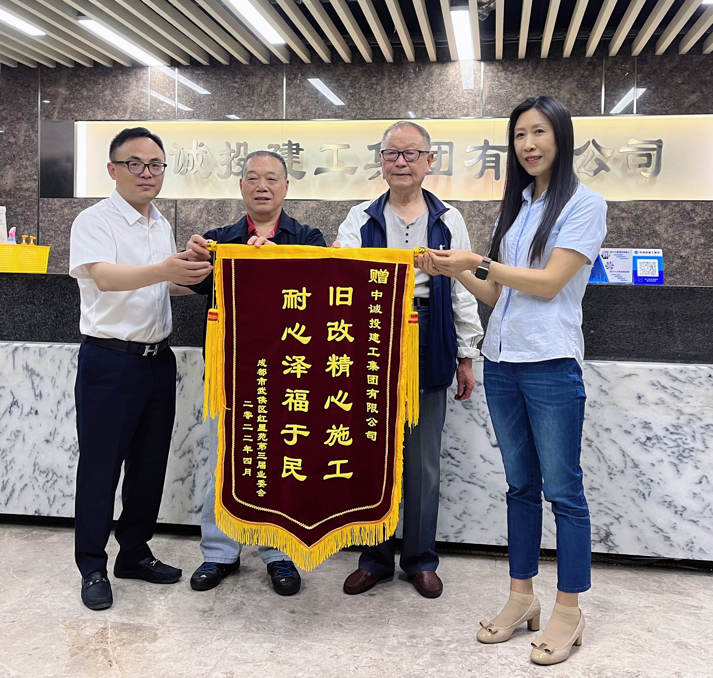4月25日上午,成都市武侯区红星苑小区居民代表卞先生和江先生将一面写有“改造精心施工 耐心福泽于民”的锦旗送到中诚投建工集团,对集团公司在承建音乐坊范围老旧院落改造中,始终坚持倾力为居民办实事解决实际问题,匠心施工保证工程质量的工作态度和工作作风表示真诚的感谢。