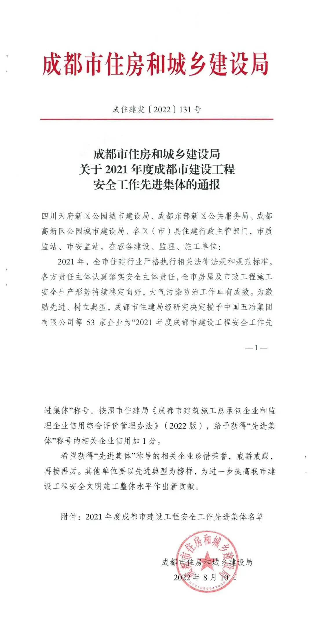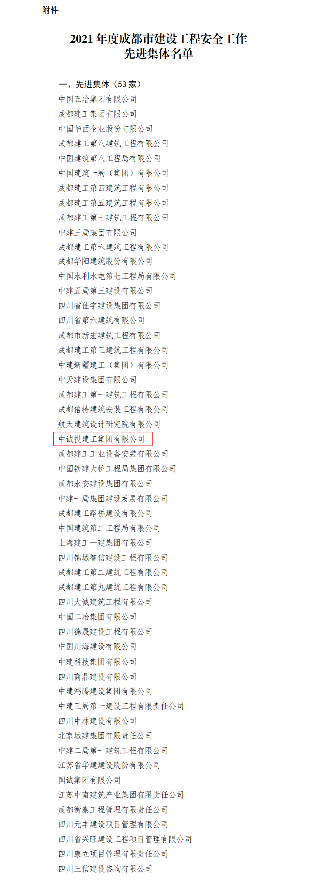 近日,成都市住建局公布了2021年度成都市建设工程安全工作先进集体名单,中诚投建工集团荣获“2021年度成都市建设工程安全工作先进集体”称号。