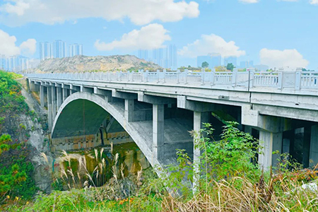 资中县凤凰大道东段市政道路工程是2021年内江市重点工程,连接资中经开区、水南镇和明心寺镇。该项目于2021年3月正式进场施工,起于凤鸣路,止于九龙峡桥,全长1.3公里。九龙峡大桥是整个凤凰大道全线上重要的节点桥梁工程,大桥全长146米,宽41.5米,路面为双向八车道通行,双侧设置了5米人行道。