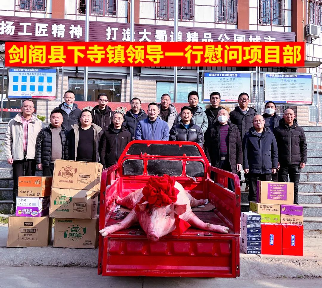 近日,剑阁县下寺镇党委书记何建国、镇长伍德利等领导一行亲临我司承建的剑阁县宝龙山职教园区及配套基础设施项目部(简称“宝龙山项目”),走访慰问坚守在一线的建筑工人,对项目部全体员工一年来的辛勤工作表示感谢,希望项目部要合理安排春节期间的工作,充分做好春节期间各项保障工作。