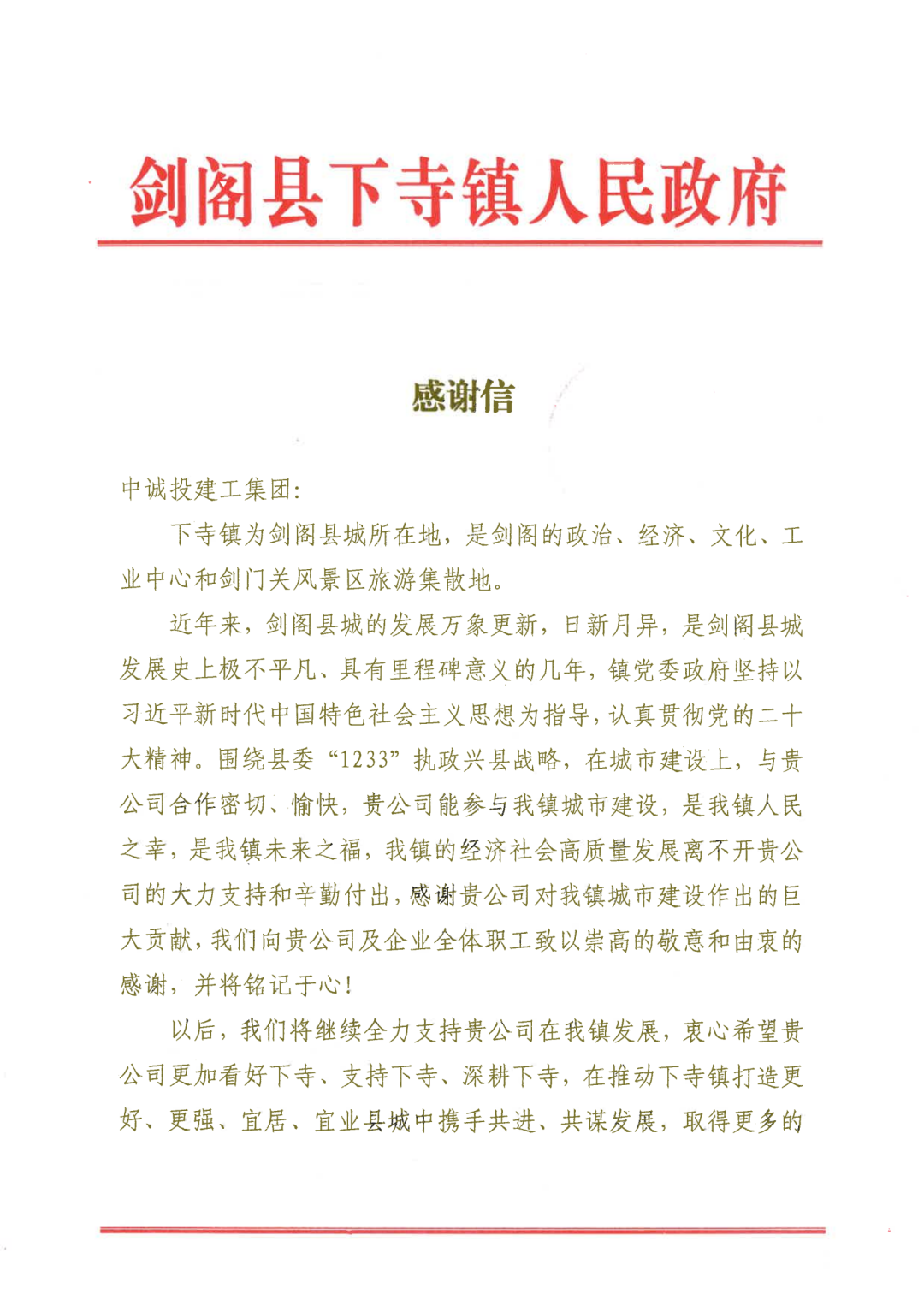 信中,下寺镇人民政府向中诚投为当地城市建设与经济社会高质量发展作出的重要贡献致以深深的感谢,并表示将继续全力支持中诚投在下寺镇的项目建设与发展,共同打造更好、更强、宜居、宜业县城。