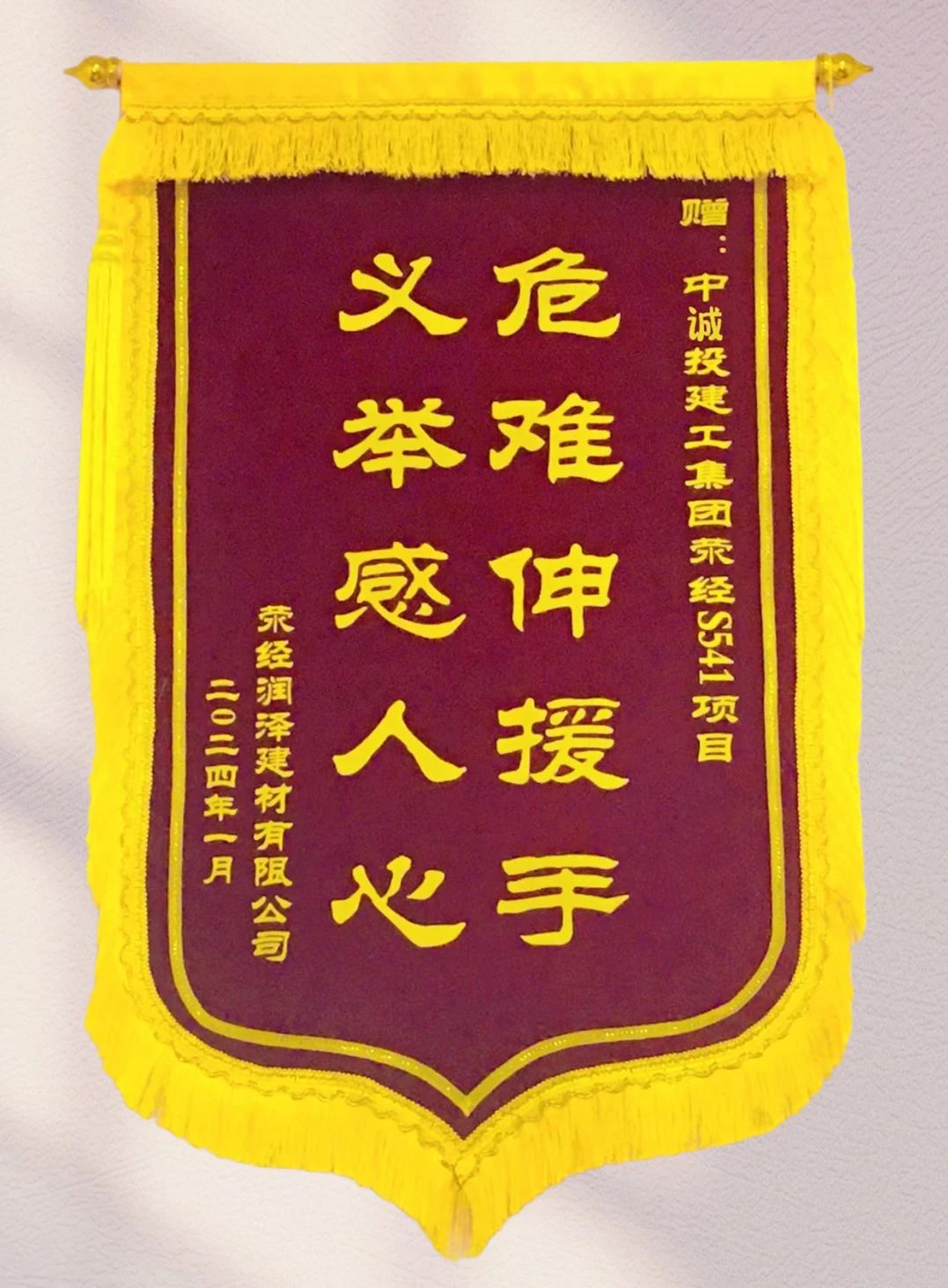 “那天多亏你们紧急送医救了我们公司的员工,挽救了一条生命,拯救了一个家庭,你们做了一件功德无量的大善事......”1月6日,荥经润泽建材有限公司商混站站长黄雪强、业务经理帅平将一面印有“危难伸援手 义举感人心”的锦旗送到了中诚投建工集团荥经S541项目部,对项目员工余华、文鹏、甘超、冉翠蓉在危急时刻临危不乱,将突发疾病的罐车司机紧急送医救治的暖心善举表示衷心感谢。