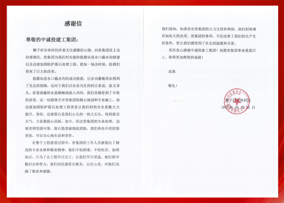 在感谢信中,狮子村全体村民对项目团队展现出的专业水准和敬业精神给予高度赞誉,对他们在工程建设过程中不畏艰难、全力建设的奉献精神表达了由衷的感激之情。这封感谢信不仅承载着村民们的深情厚谊,更是对中诚投服务民生、助力地方发展的高度认可。