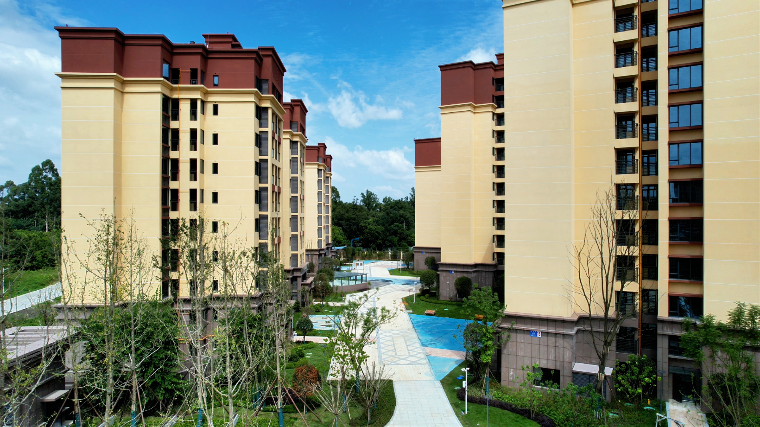 小区外立面采用统一的浅黄色与红棕色搭配,简洁大气。步入小区,一幅“宜居画卷”缓缓展开。中庭草坪绿草如茵,各类灌木错落有致,宛如天然氧吧;休闲区域铺设了彩色塑胶地面,健身器械区与景观步道相连,为老幼居民提供了便捷的活动空间。这种“绿化+休闲”的空间设计,不仅使小区环境井然有序,更实现了从“有居”到“优居”的品质提升,让居民在家门口就能享受优质普惠的公共服务。